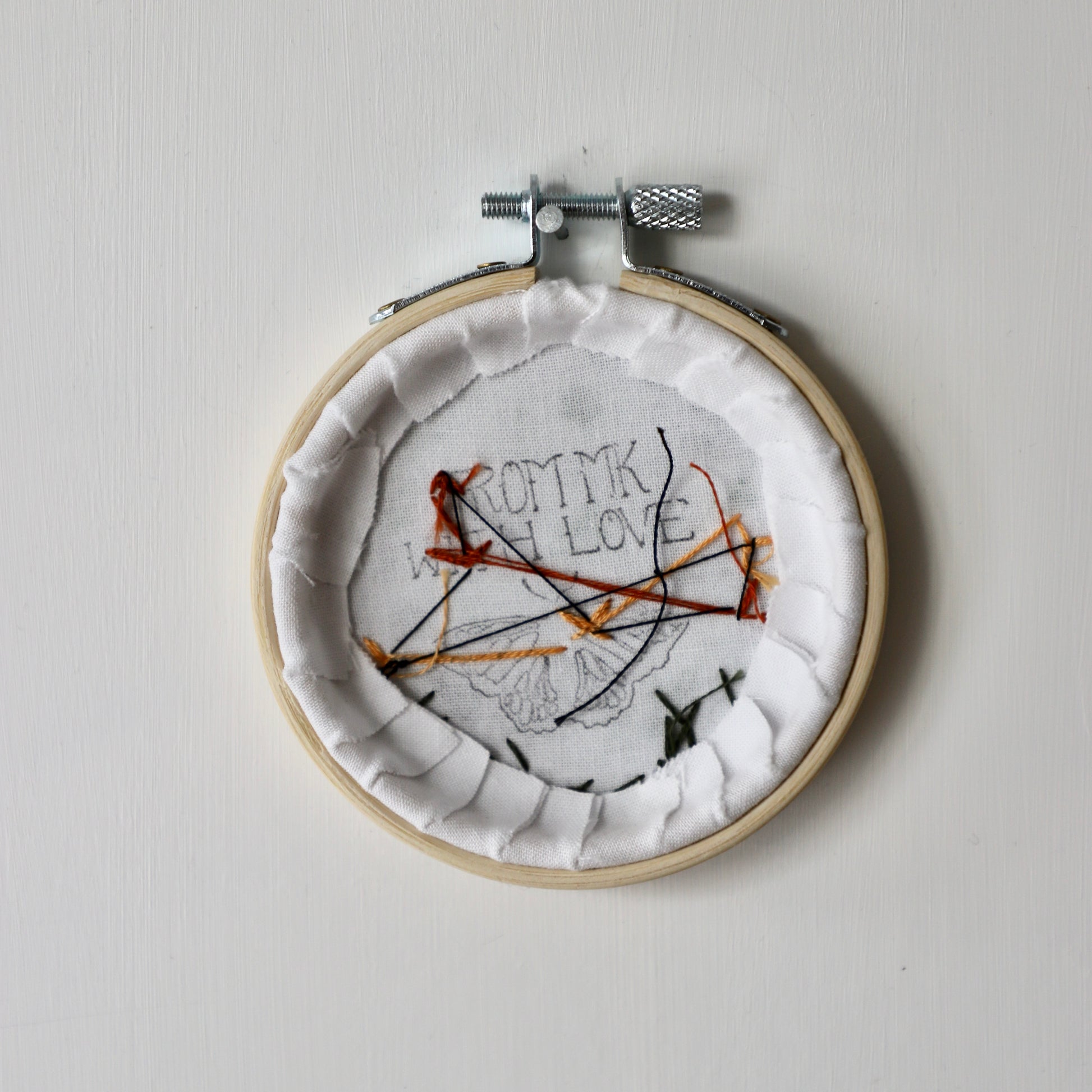 This lovely pair is a combination of acrylic paint, hand embroidery and cotton fabric in a 3" embroidery hoop.