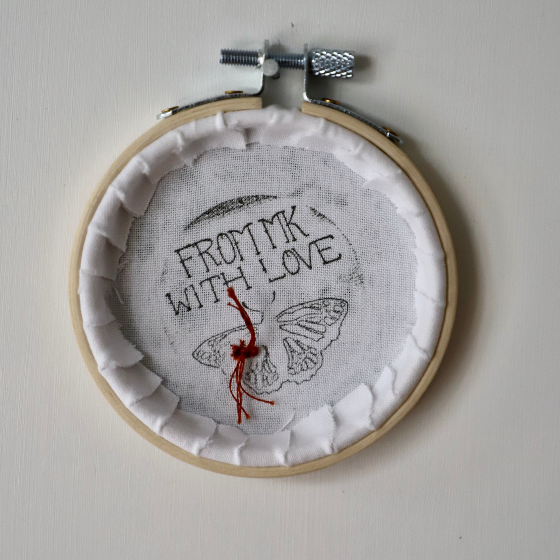 Made with acrylic paint and hand embroidery on two layers of cotton fabric.