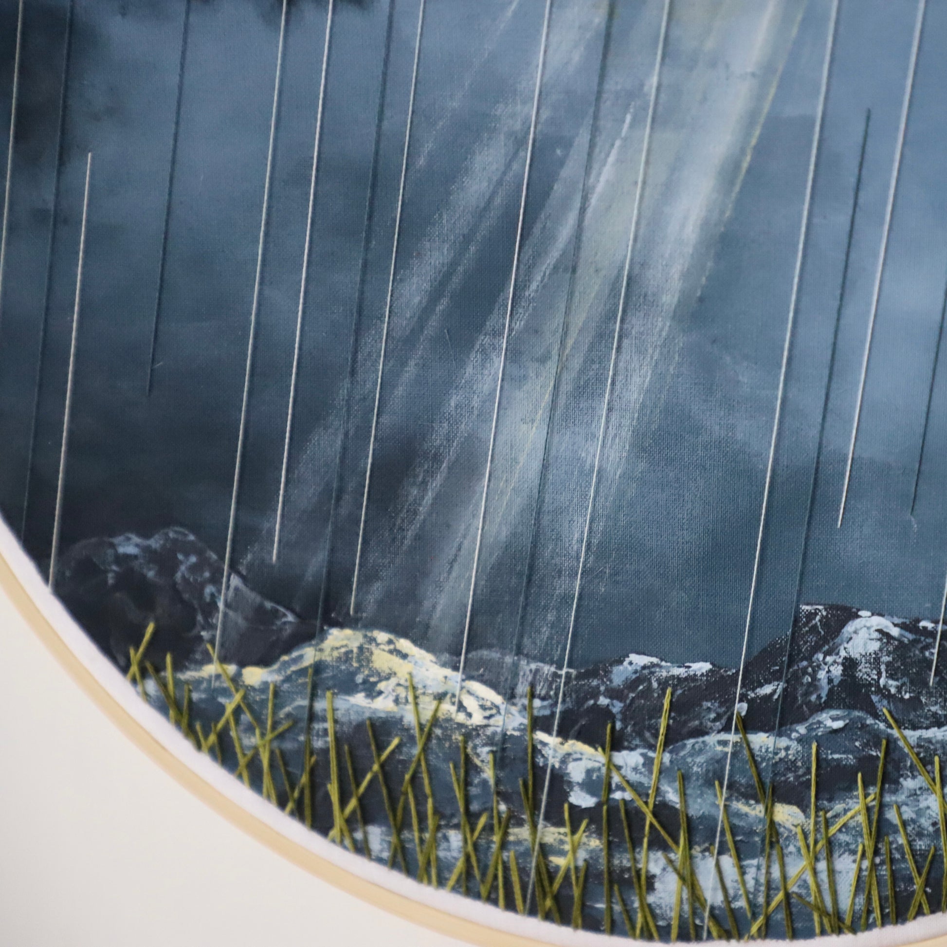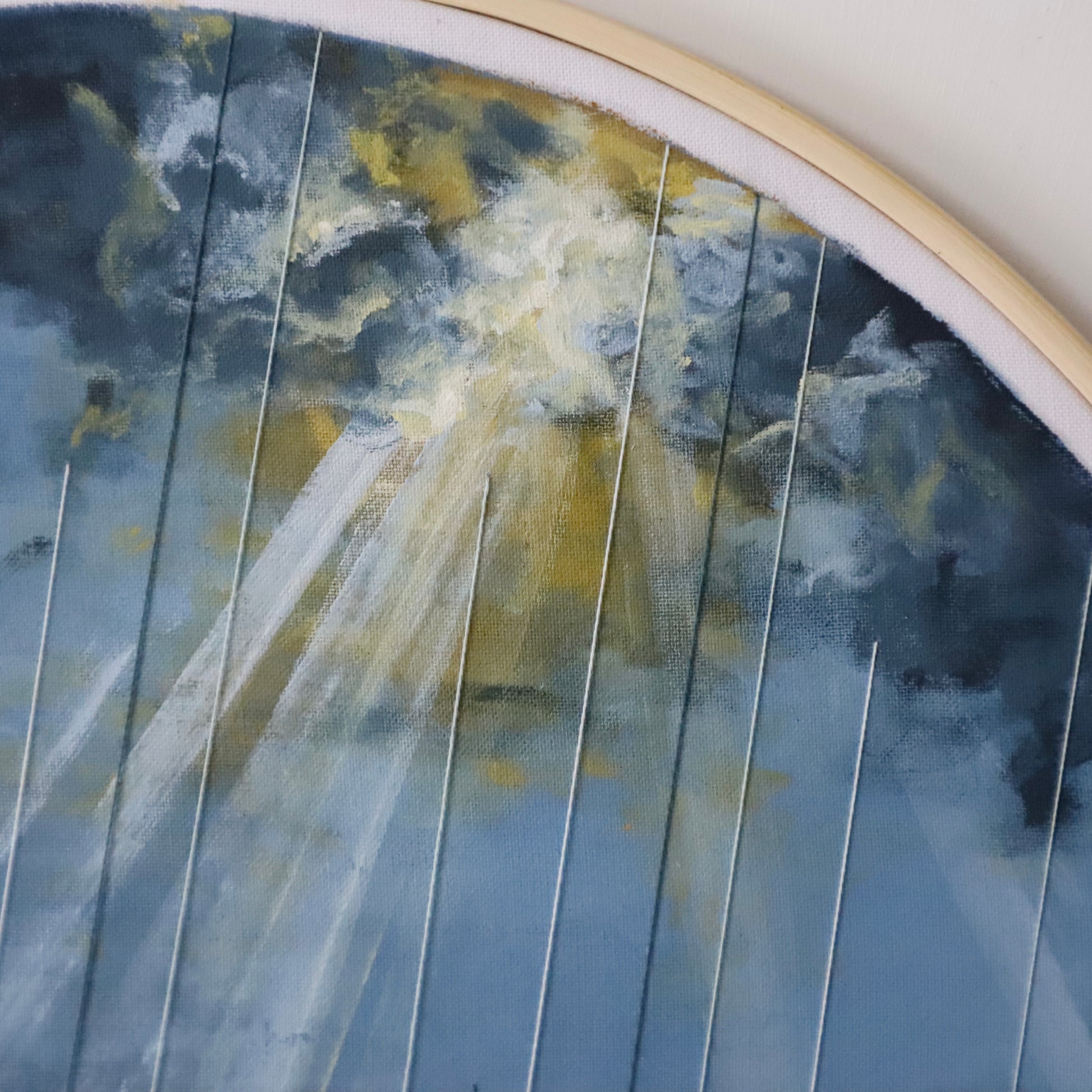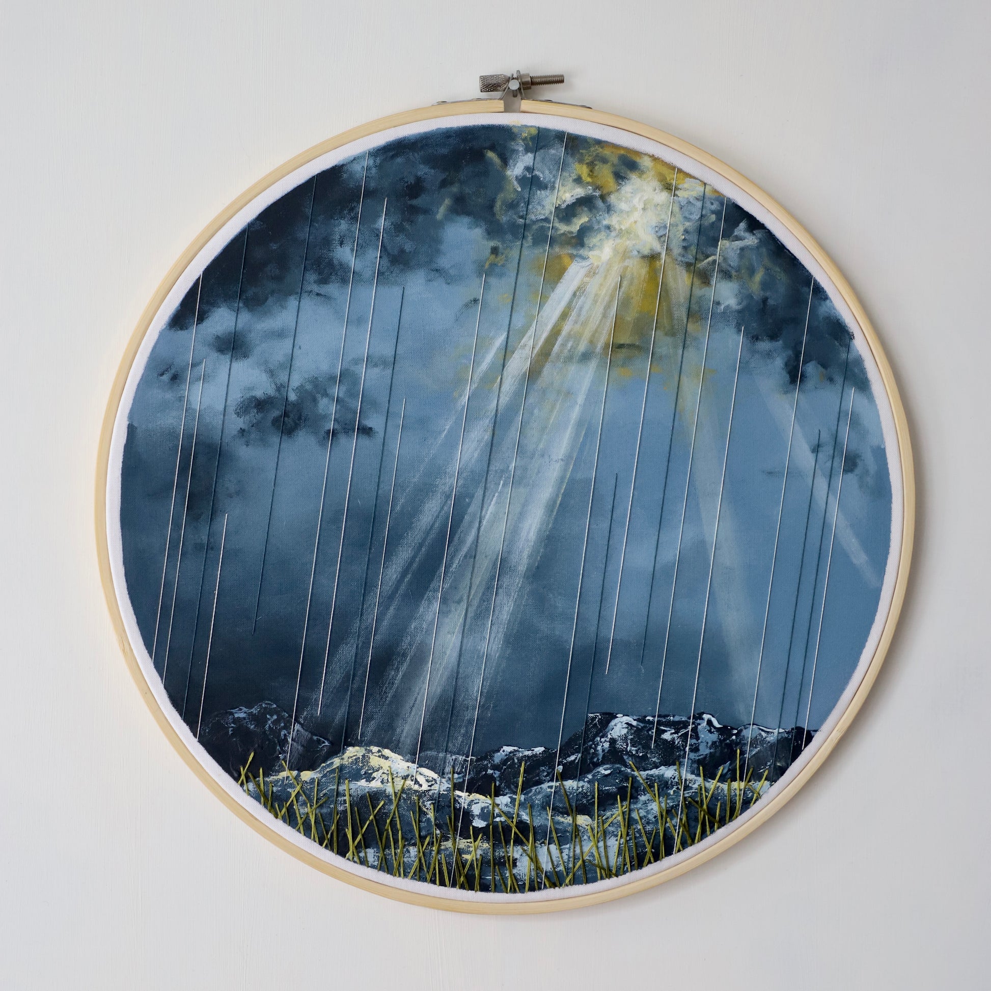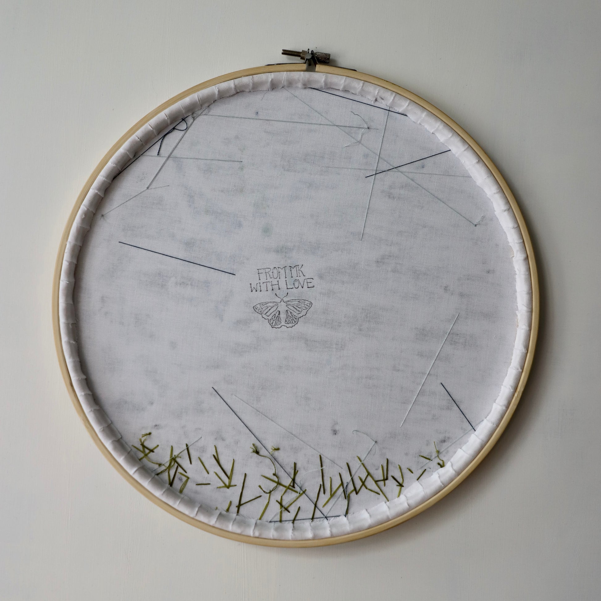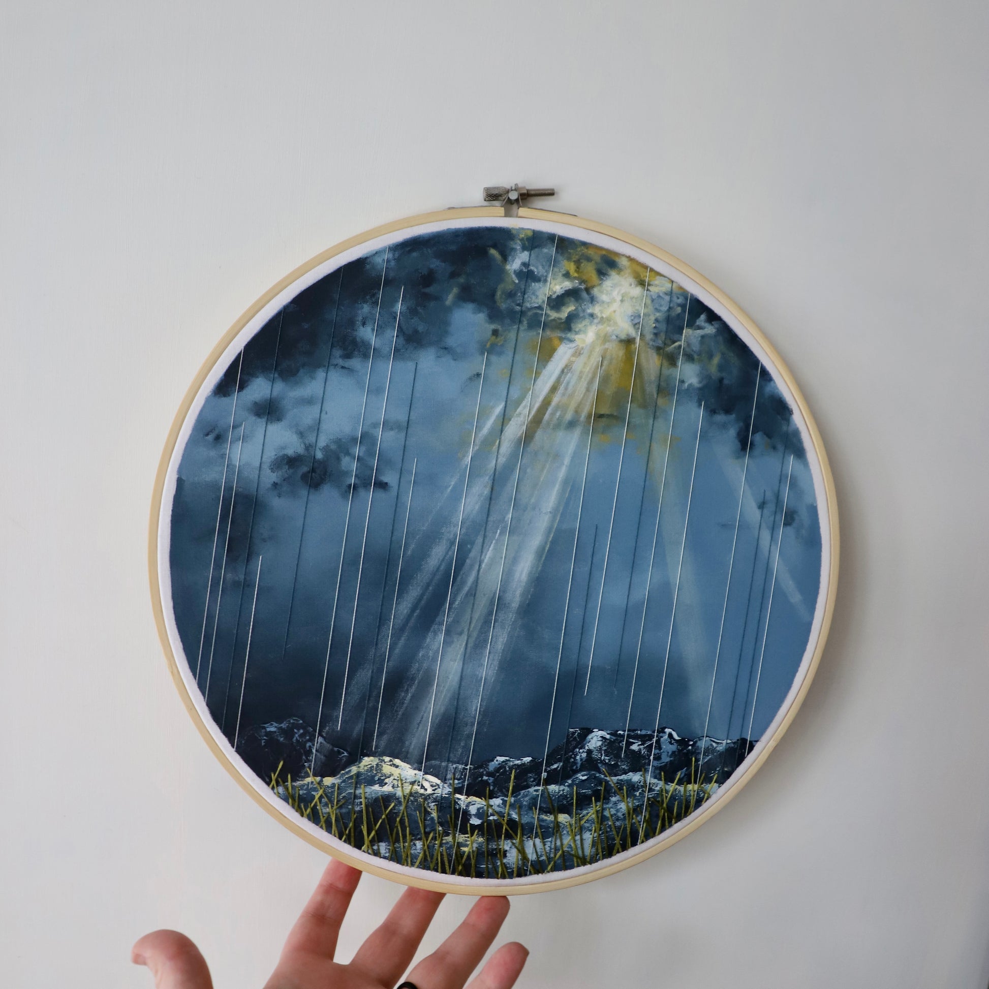 Made with acrylic paint and hand embroidery on two layers of cotton fabric. Stretched inside a 14 inch wooden embroidery hoop.