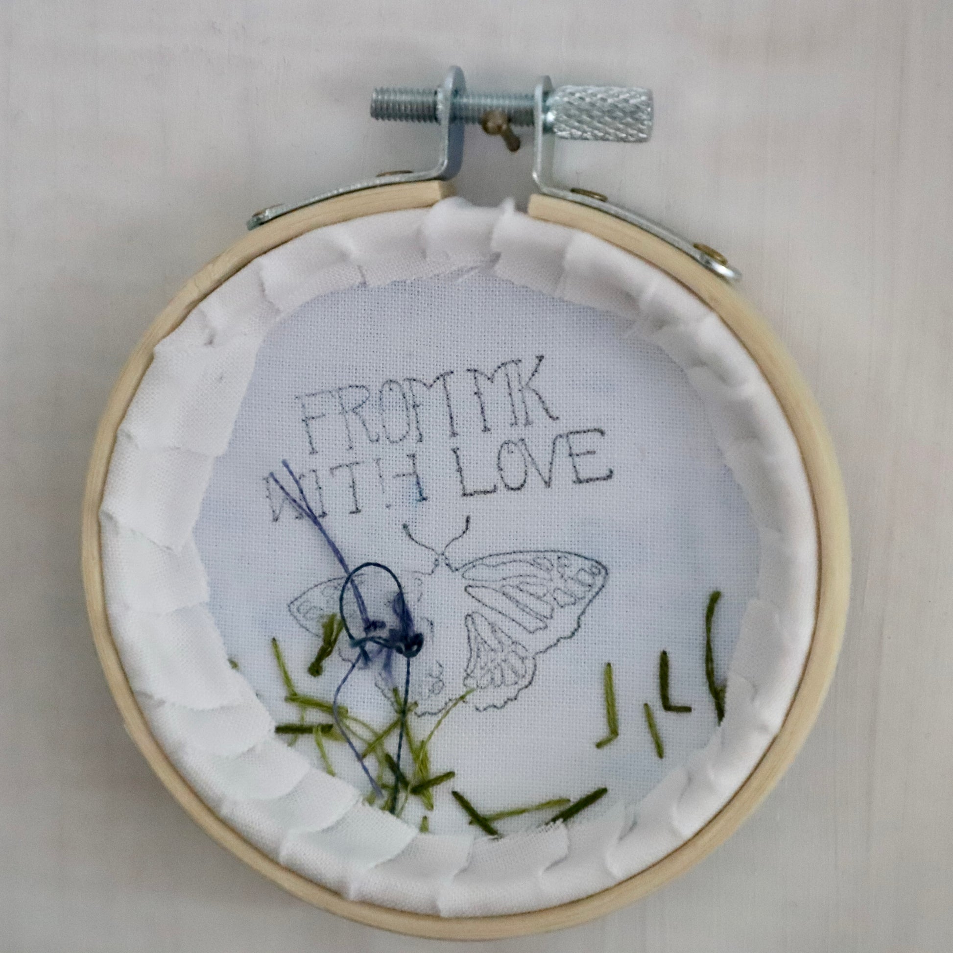 Stretched inside a 3 inch wooden embroidery hoop.