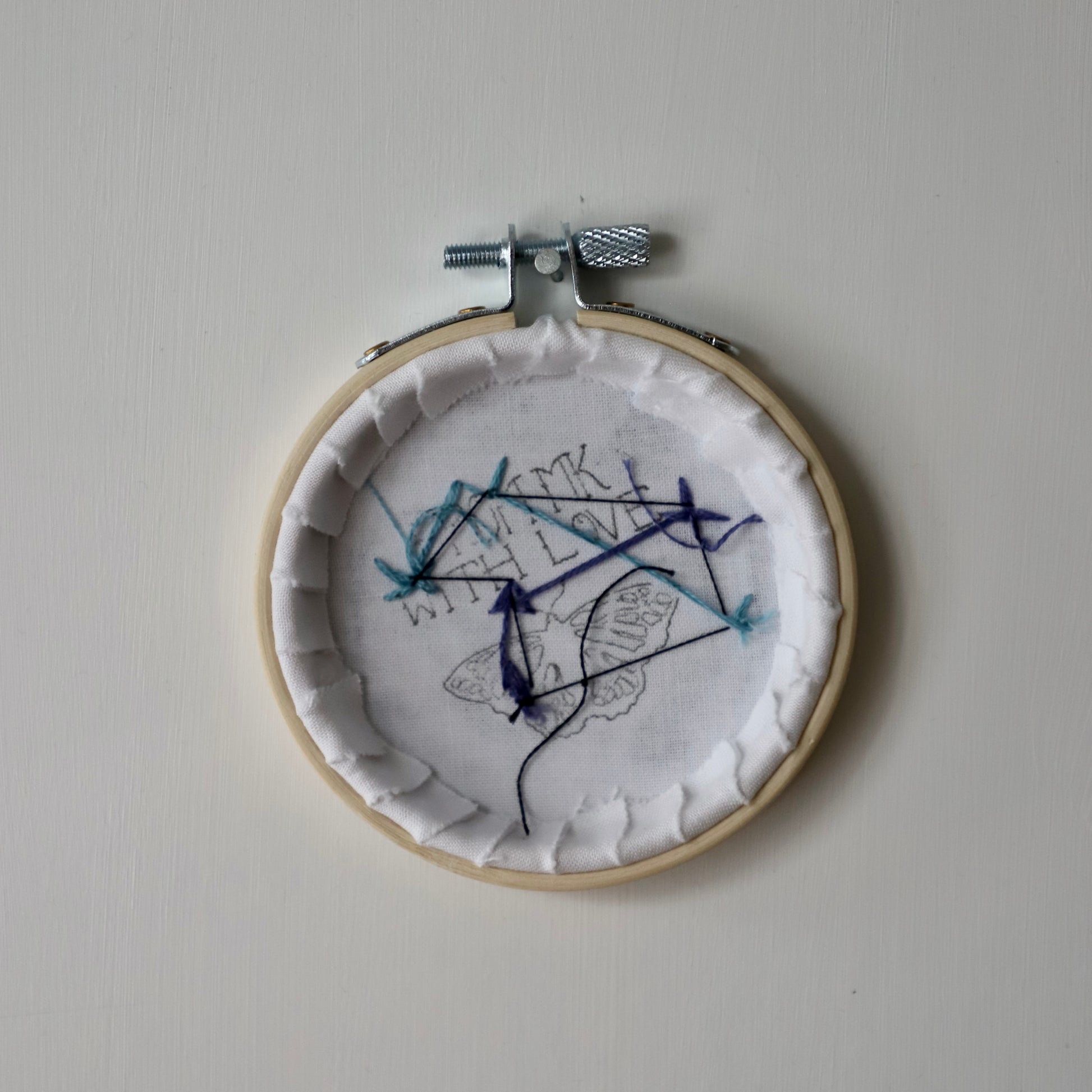 Made with acrylic paint and hand embroidery on two layers of cotton fabric.