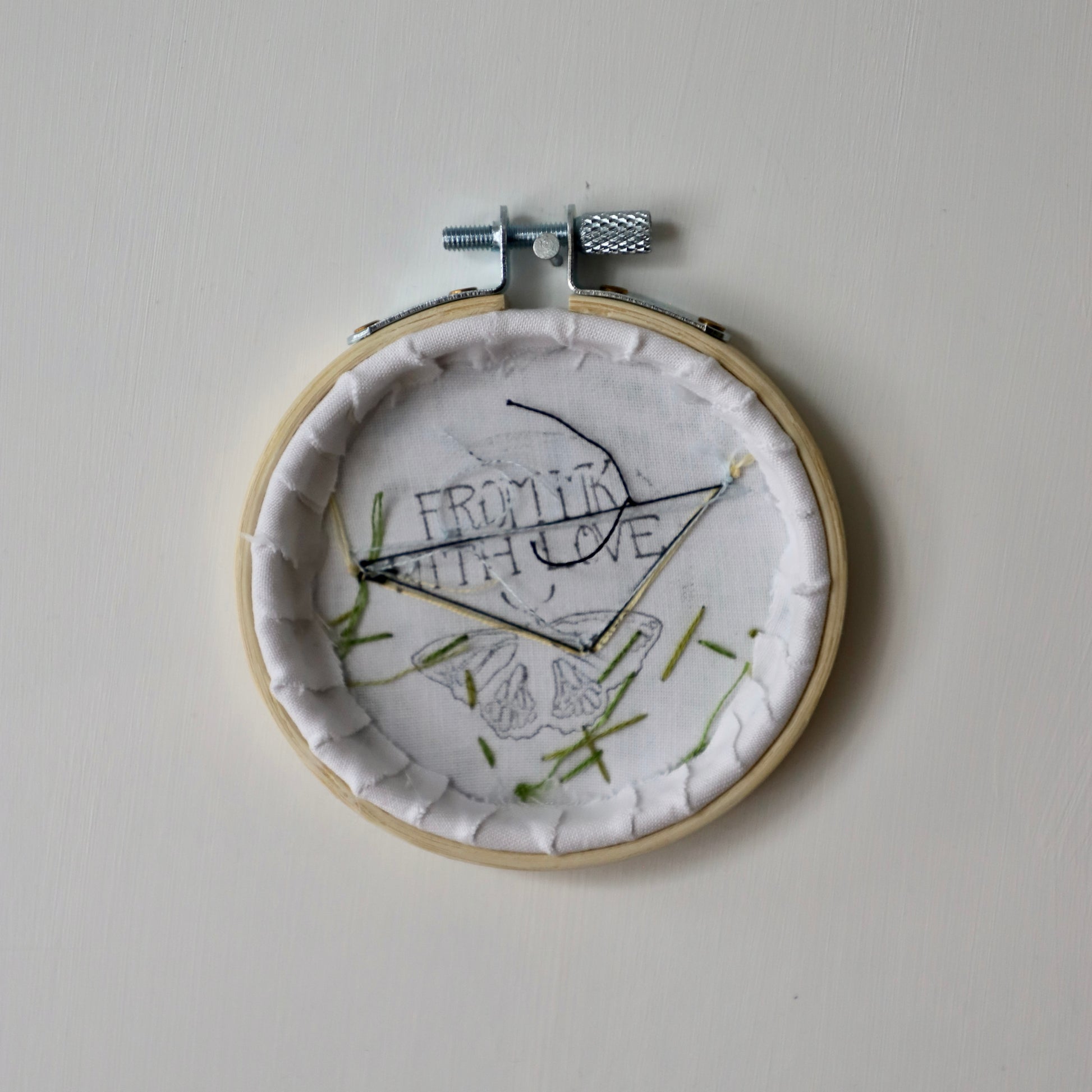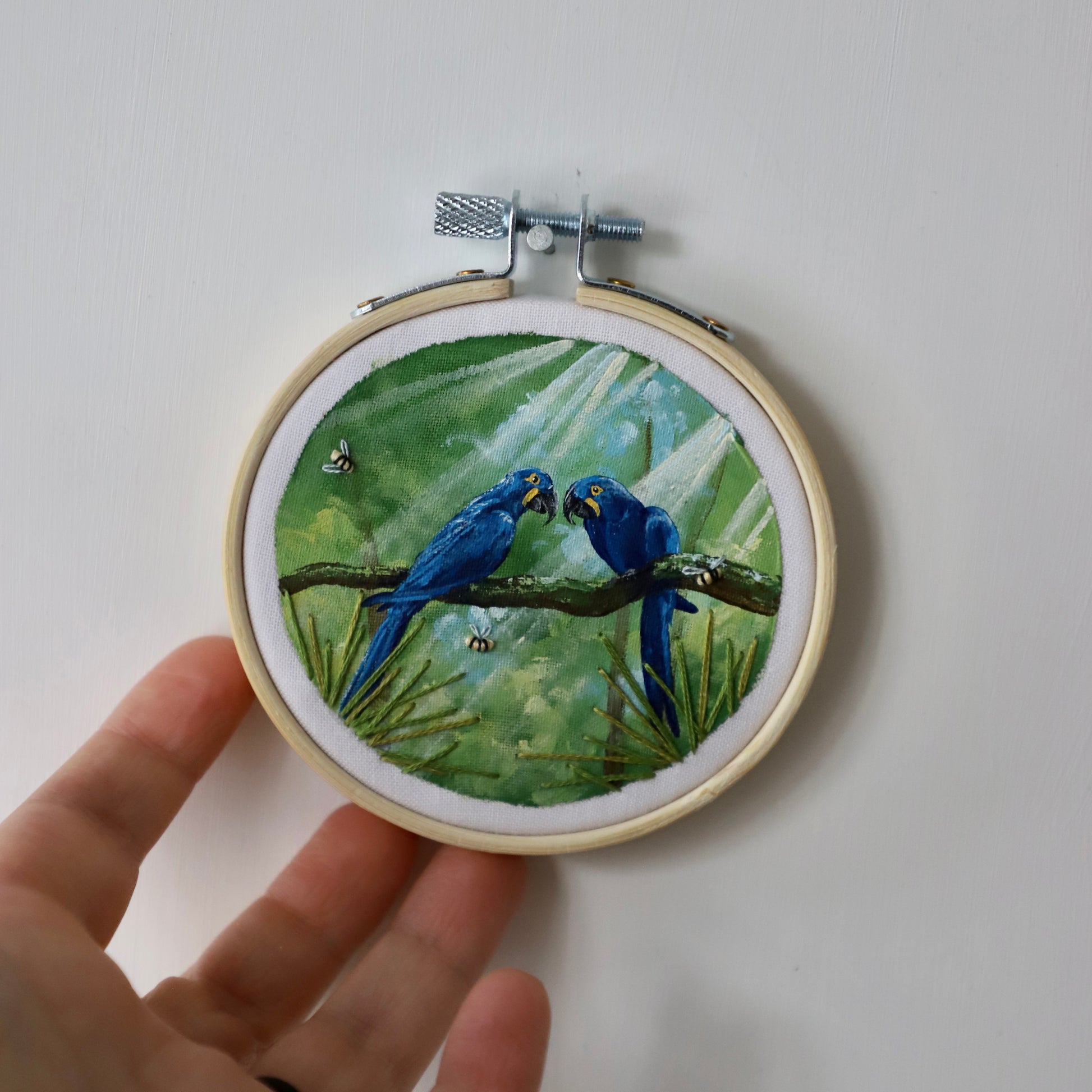 Made with acrylic paint and hand embroidery on two layers of cotton fabric.