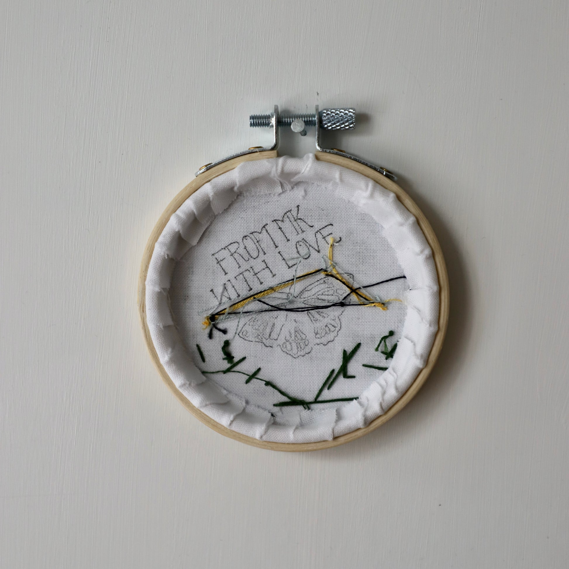 Made with acrylic paint and hand embroidery on two layers of cotton fabric.