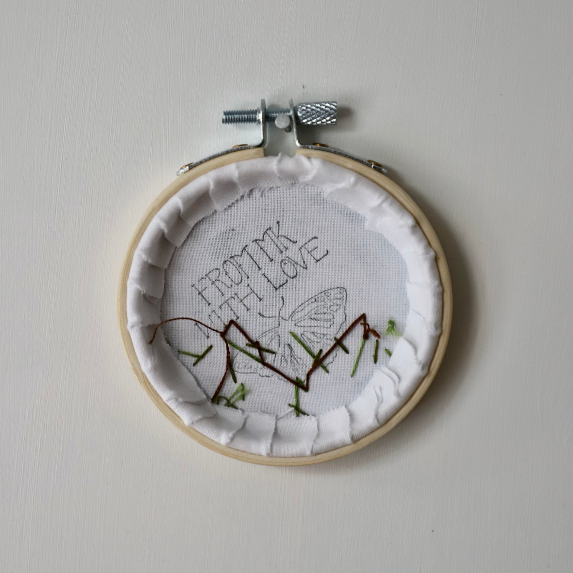 Made with acrylic paint and hand embroidery on two layers of cotton fabric.