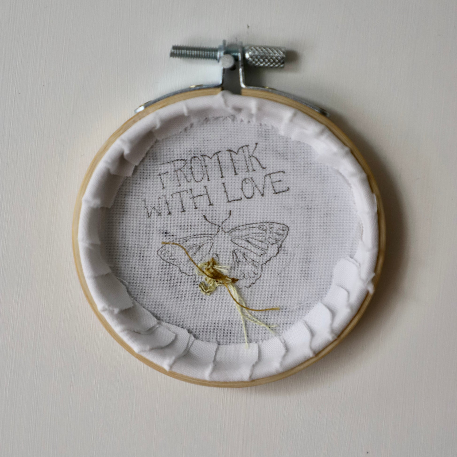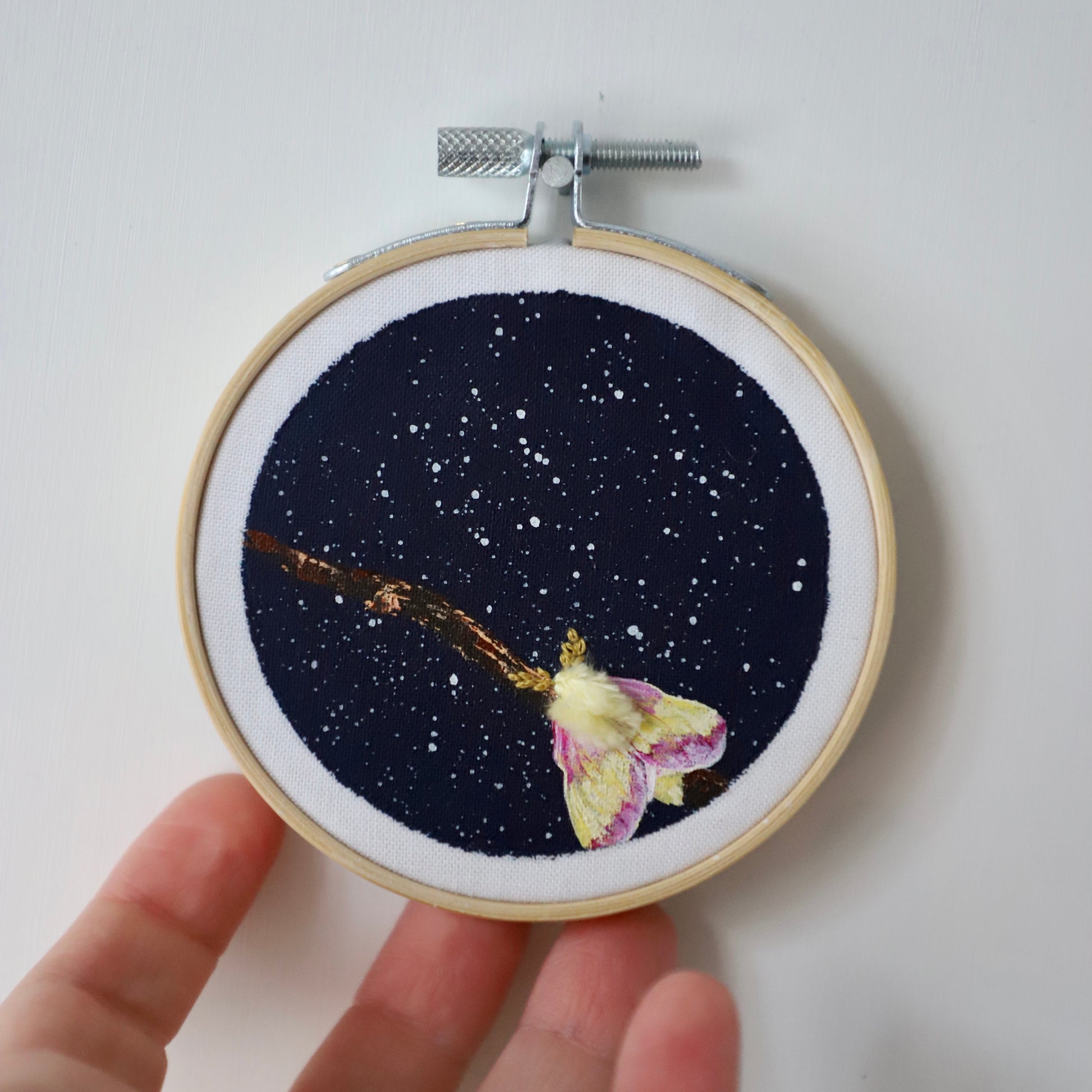 Made with acrylic paint and hand embroidery on two layers of cotton fabric.