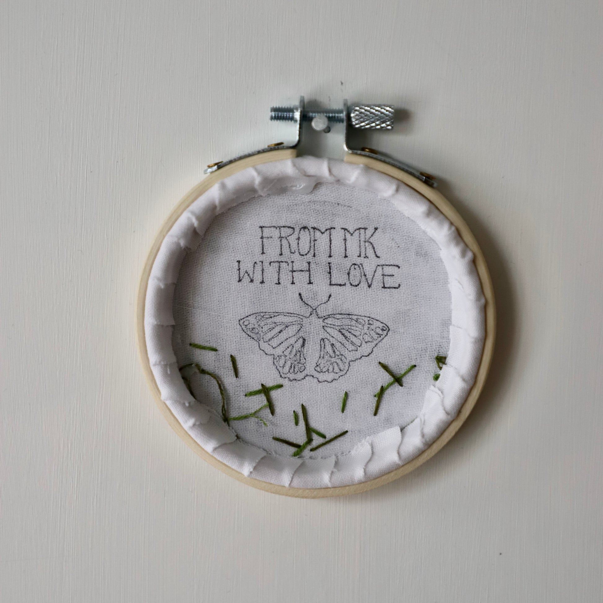Stretched inside a 3 inch wooden embroidery hoop.